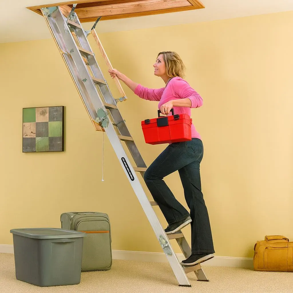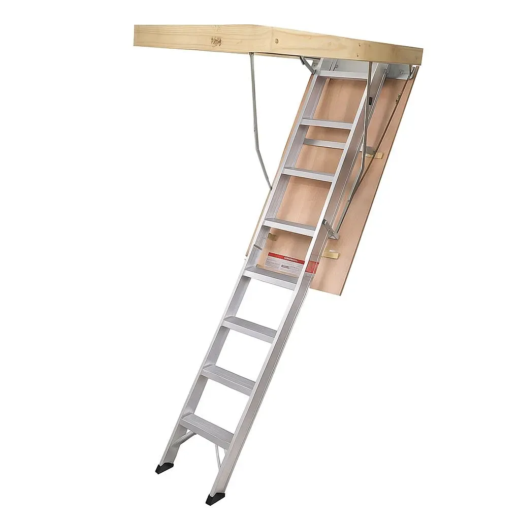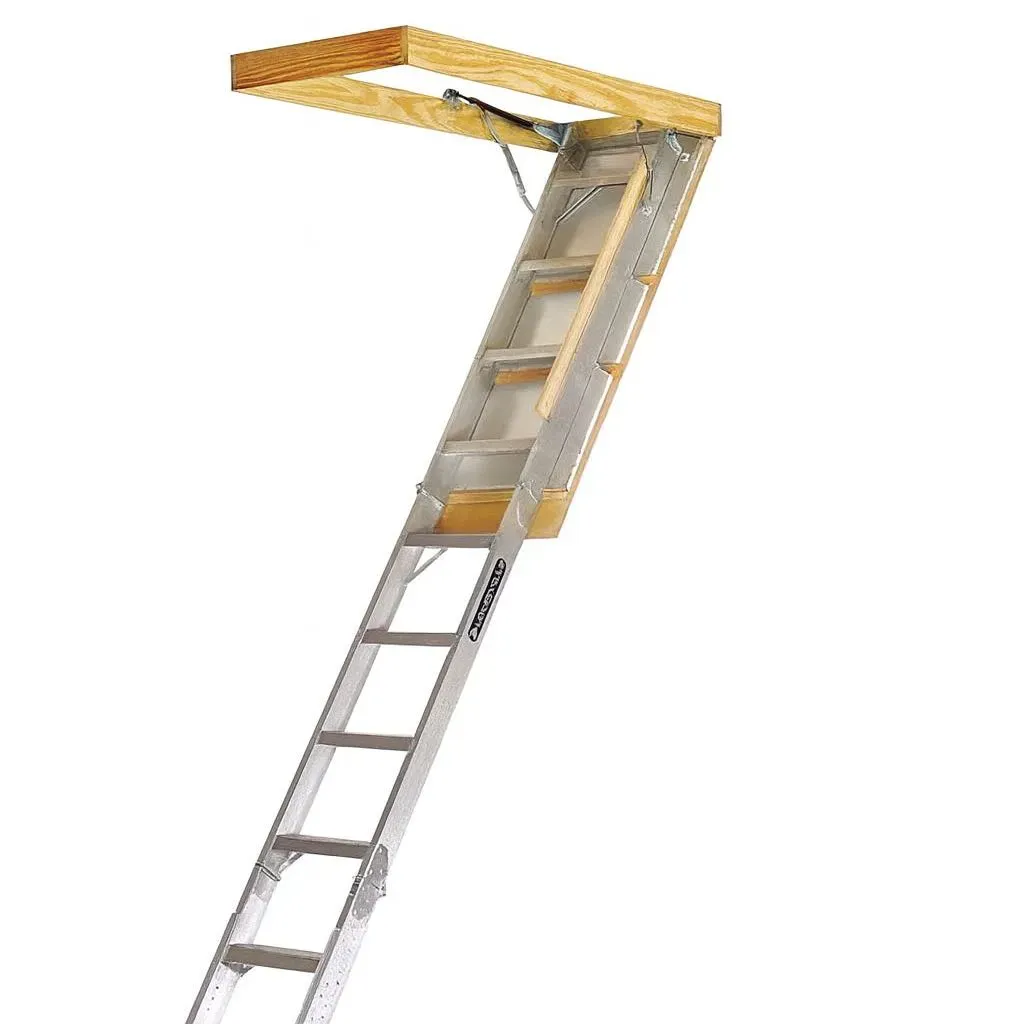 Escalera de ático de aluminio con marco de madera de pino, ideal para alturas de 210 a 300 cm. Resistente y segura, con capacidad máxima de 170 kg. Marca Louisville Ladder. Perfecta para espacios de áticos. ¡Hazte con la tuya hoy mismo!
