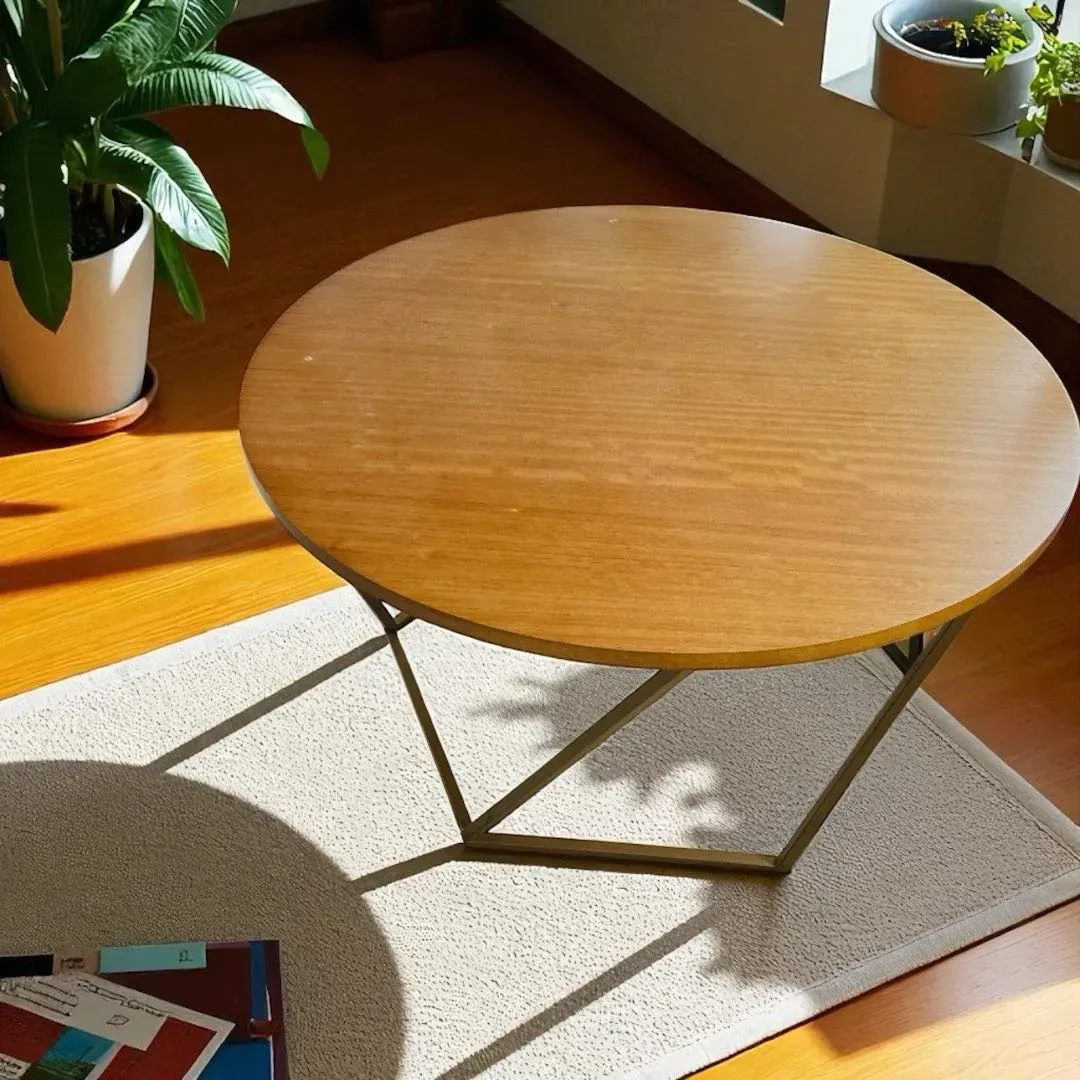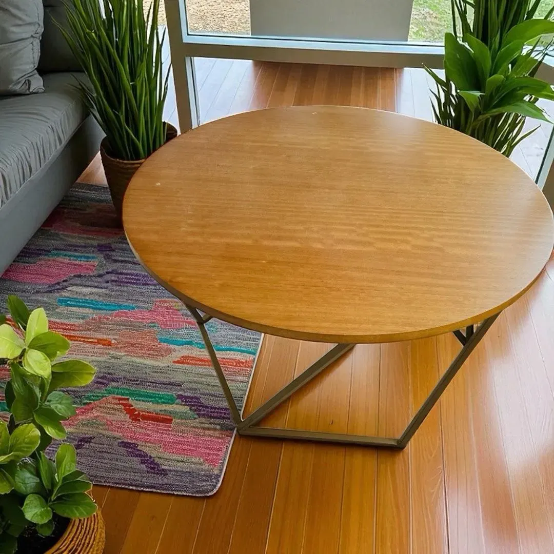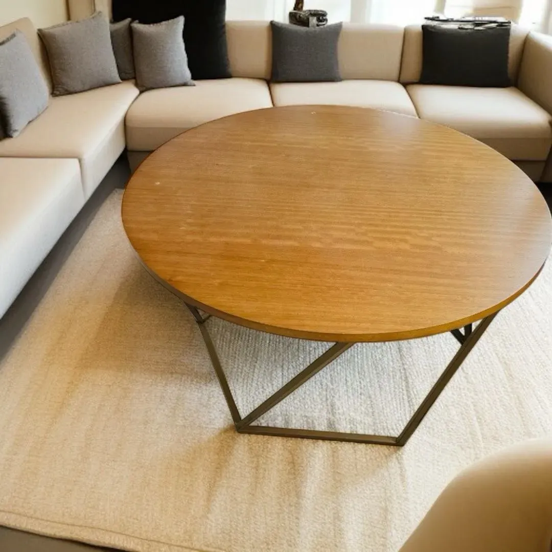 Mesa de centro elegante en color nogal con base de metal dorado mate lacado, ideal para dar un toque de sofisticación a tu sala de estar. El diseño moderno y la calidad del material hacen de esta mesa un complemento perfecto para tu hogar.