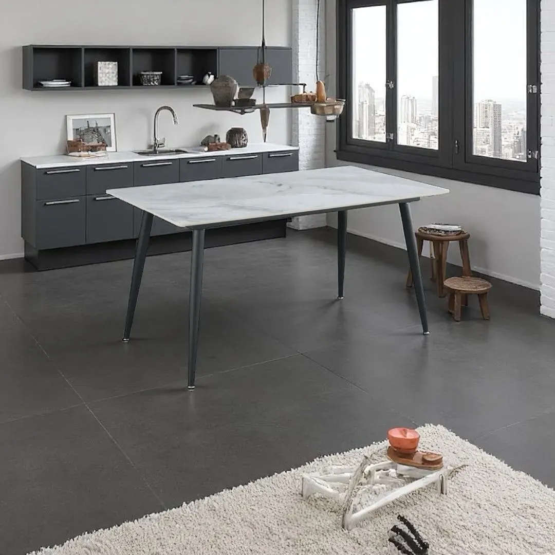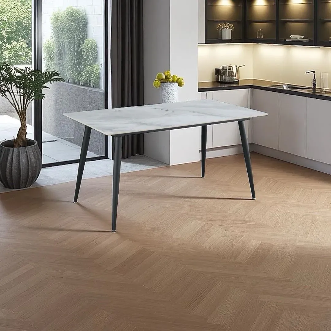 Mesa de comedor SAIKO 363617 con mesón de piedra sinterizada en elegante color jade blanco. Esta mesa de comedor es perfecta para tu hogar, brindando estilo y funcionalidad a tus espacios. Fabricada con materiales de alta calidad, es ideal para muebles de comedor modernos y sofisticados.