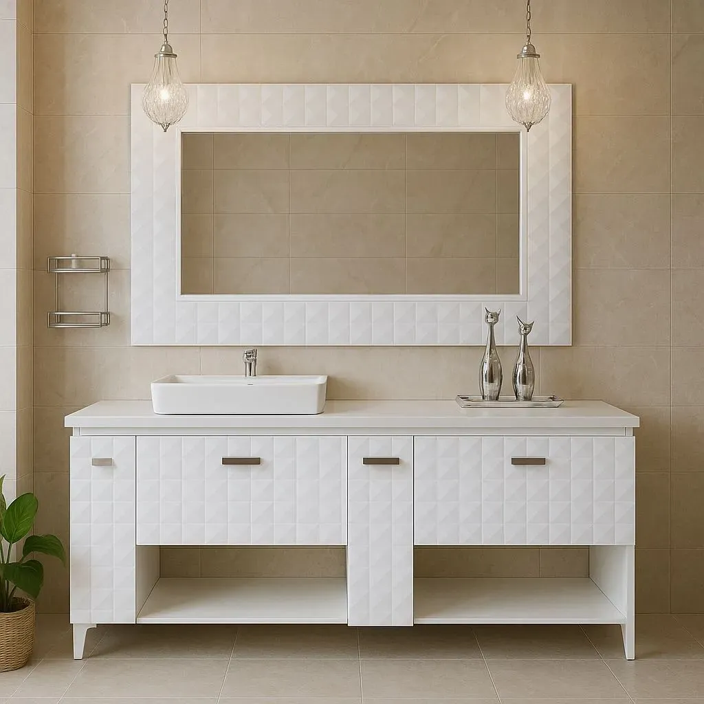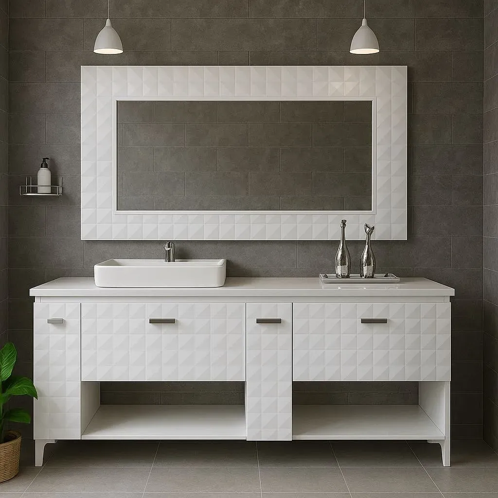 Mueble de baño Importnovum 3D con mesón de cuarzo nano Glas en color blanco, que incluye espejo, cuarzo y lavamanos. Este elegante mueble de baño es perfecto para darle un toque moderno a tu hogar. Código de espejo: 4383, código de mueble: 4382, código de lavamanos: CL1430. ¡Haz de tu baño un espaci...