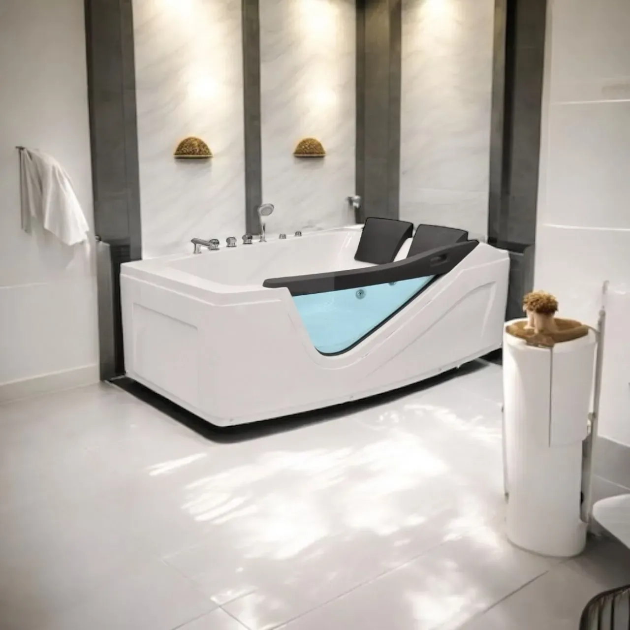 Transforma tu baño en un auténtico espacio de relajación con el Jacuzzi Hidromasaje Derecho 69080, diseñado para ofrecer lujo, confort y bienestar en cada uso. Perfecto para dos personas, este elegante hidromasaje en color blanco combina diseño moderno, funcionalidad avanzada y materiales de alta ca...